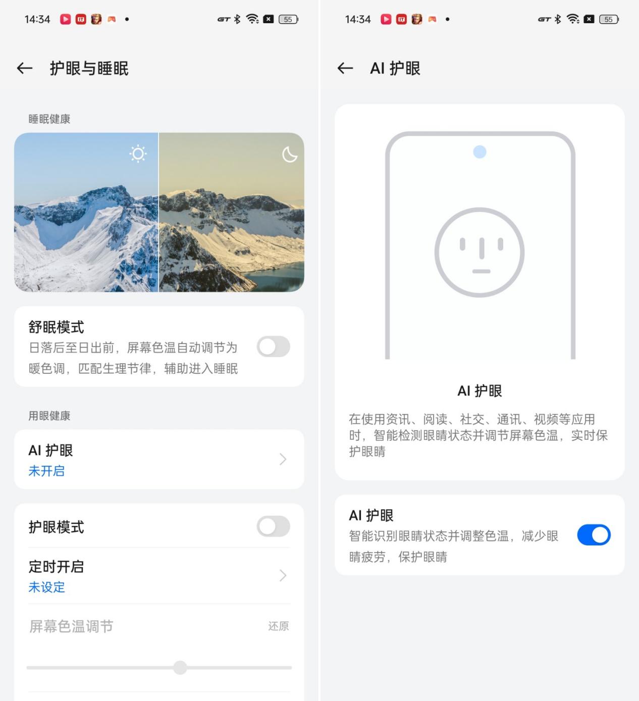 屏幕亮度提高后,很多朋友可能会考虑到护眼,真我 GT Neo6 SE 也想到了这一点,它首发了绿野 AI 护眼功能,这是行业首个主动式护眼方案,首次引入入主动眼部疲劳检测功能,通过前置摄像头 AI 自动检测和判断用户的疲劳状态,动态调整类环境色自适应、舒眠模式和护眼色温等多种护眼功能。相较传统的被动调节参数护眼,它能够主动检测用户的疲劳程度,逐级动态调节合适的护眼功能。具体来说,大家可以在系统设置中“显示与亮度”-“护眼与睡眠”中开启 AI 护眼,打开后,确实感觉屏幕观感更加柔和和舒适,不是仅仅将色温变黄的感觉。