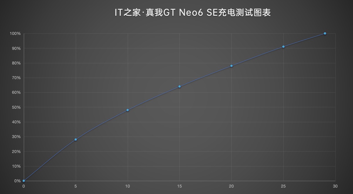 充电方面,真我 GT Neo6 SE 搭载 5500mAh 的大电池,标配 100W 光速秒充充电器,IT之家实测电量从 0% 充满到 100% 一共耗时 29 分钟,其中 15 分钟就可以充到 64%,速度还是很快的。