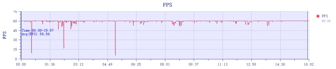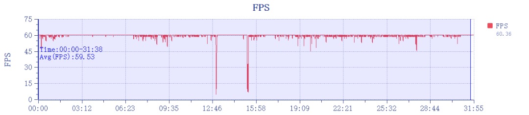 可以看到,真我 GT Neo6 SE 运行《原神》的平均帧率能达到 59.53fps,和刚才《逆水寒》差不多,帧率曲线整体也是很平整的,中间的两处显眼掉帧是游玩时切换室内外场景的加载界面,可以忽略。