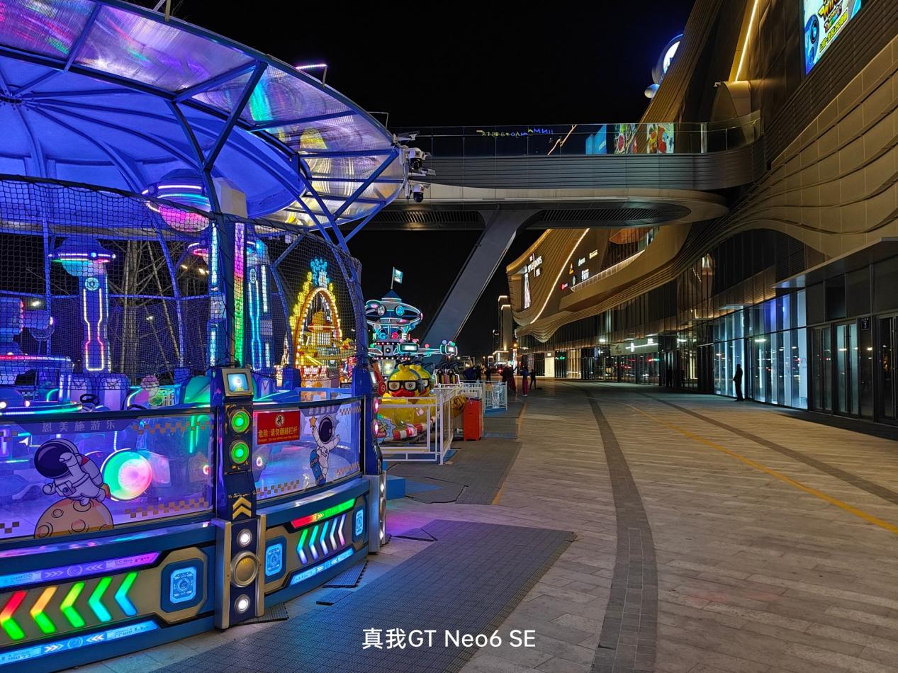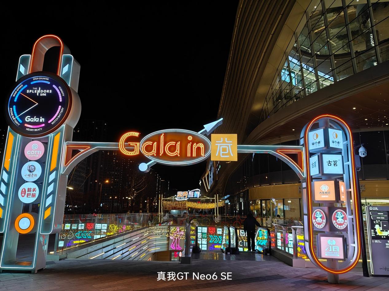在夜晚场景下,真我 GT Neo6 SE 支持 SuperOIS 超级光学防抖技术,拍摄出的画面整体亮度和纯净度都能让人满意,动态范围方面,并没有一味地追求对高光的压制,看霓虹灯高亮的地方,轻微有些过曝和溢出,但并不影响整体的观感。