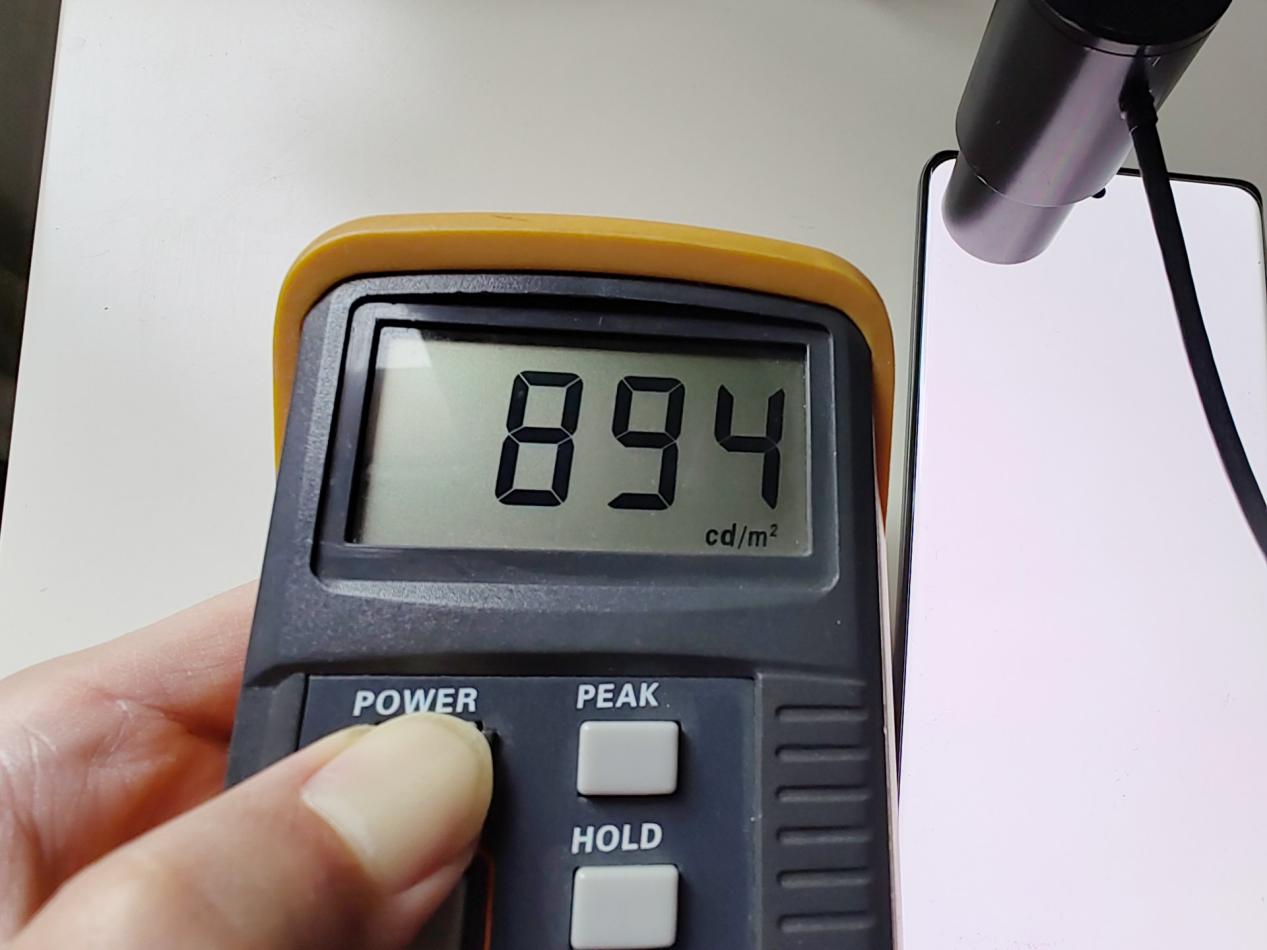 打开该选项后,小编将系统亮度拉满,然后全屏显示纯白的图片,这时测得屏幕最高亮度达到 894nit,有一瞬间还能升到 900nit 以上,这个亮度确实是相当出色的。