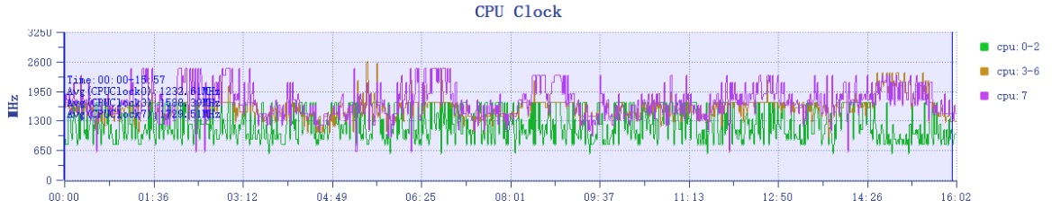 再看第三代骁龙 7 + 的核心调度情况,Cortex-X4 全程的性能输出还是比较积极的,基本上在 1.5GHz-2.5GHz 之间波动,A720 大核和 A520 小核也能保持稳定高频的性能输出,由此才能带来流畅顺滑的游戏体验。