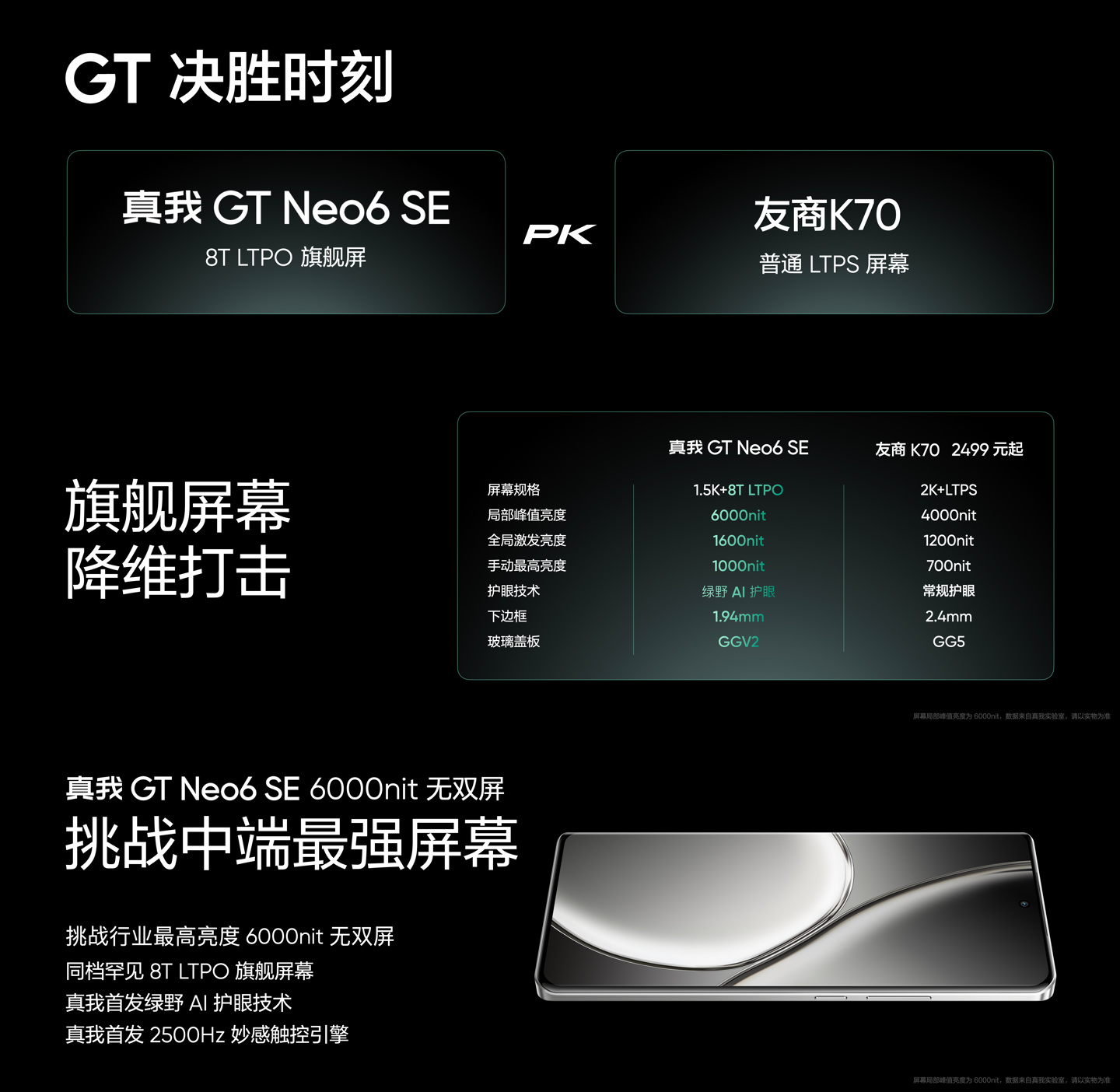 屏幕方面,真我 GT Neo6 SE 首发 6000nit 无双屏,这是一块 6.78 英寸 2780×1264 柔性 OLED 屏幕,采用京东方 S1 发光材料,拥有 1000nit 手动最高亮度、1600nit 全局激发亮度、6000nit 局部峰值亮度,支持 120Hz 刷新率(8T LTPO),2500Hz 瞬时触控采样率,2160Hz 高频 PWM 调光,3+1 Pulse 类 DC 低频闪技术,支持湿手触控(OTA),支持旗舰同款 Pro-XDR 显示,首次搭载游戏超级 HDR,使用了康宁 Victus 2 保护玻璃,边框窄至 1.36mm。