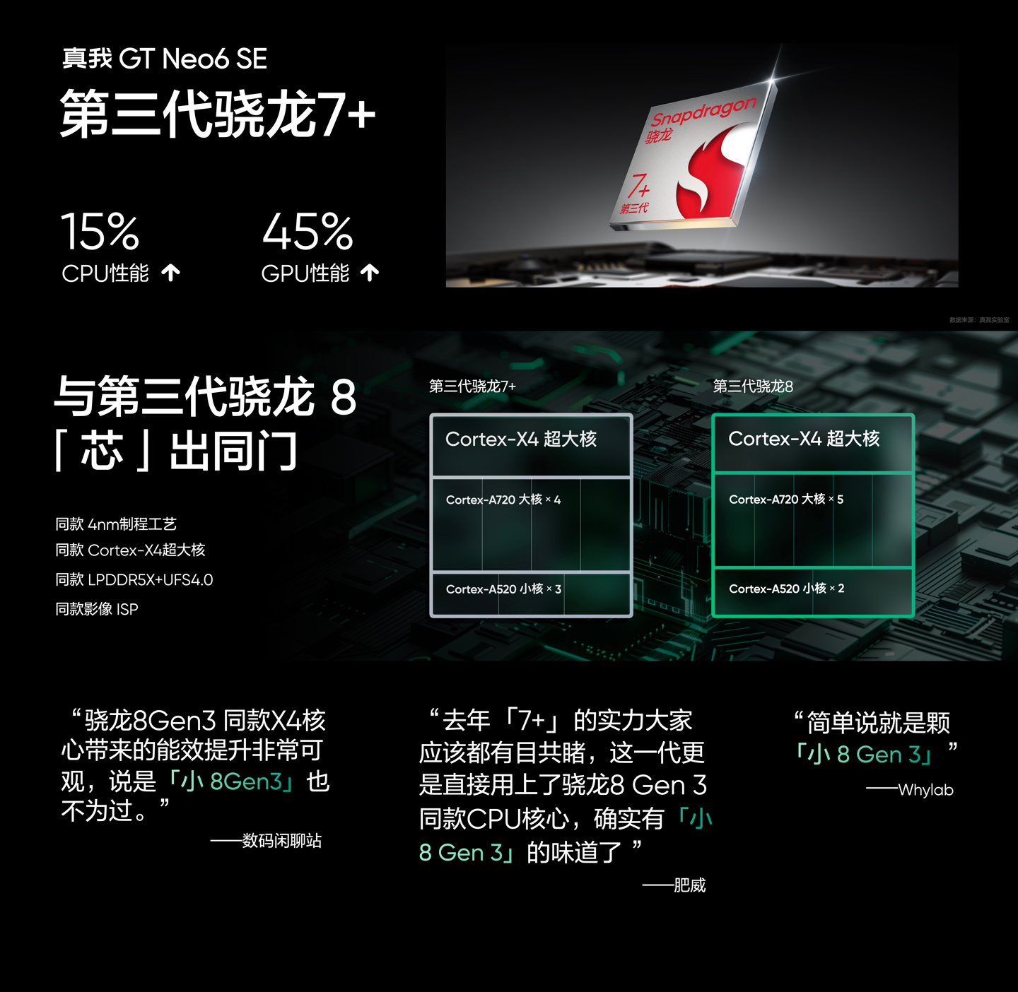 性能方面,真我 GT Neo6 SE 搭载第三代骁龙 7 + 处理器,与骁龙 8Gen3 同工艺同款架构。采用 10014mm² 超万级散热 VC + 中框冰封结构,支持 GT 模式 5.0、极客性能面板 2.0、燃模式,支持《王者荣耀》自适应画质、游戏专属内存 Pro,游戏桌面小窗,全频段电竞天线矩阵。
