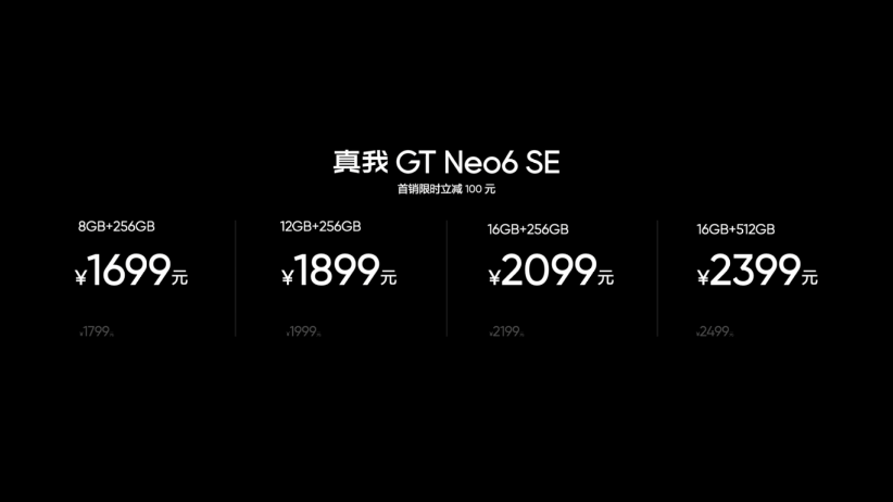真我 GT Neo6 SE 今日 11:30-24:00 开启限时尝鲜购,4 月 17 日全渠道开售,IT之家附具体售价如下(首销立减 100 元):