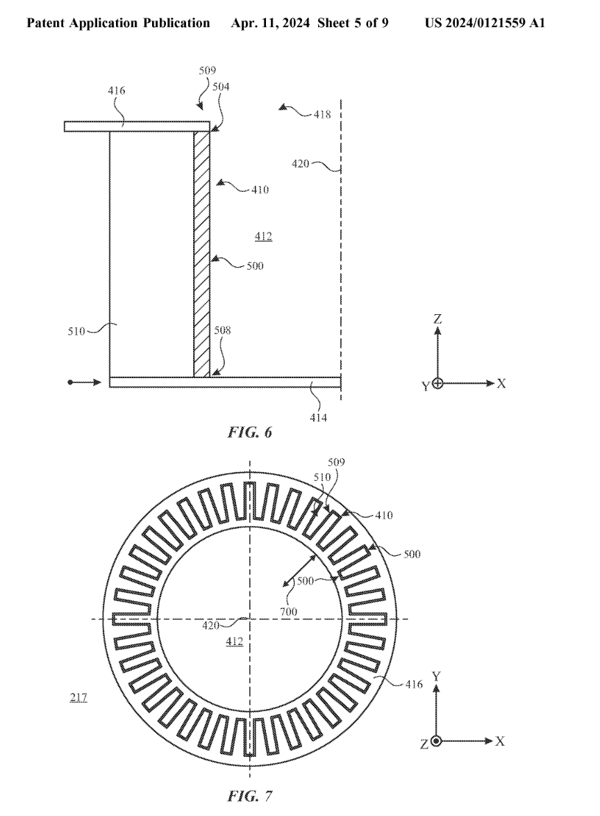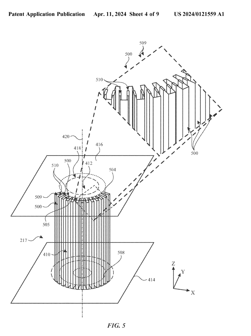 苹果在专利中探索了圆柱形波纹 MEMS 结构,采用开放式圆柱形磁芯可与 MEMS 扬声器流体耦合,可安装在扬声器的前部音量(front volume)和后部音量(back volume)之间。