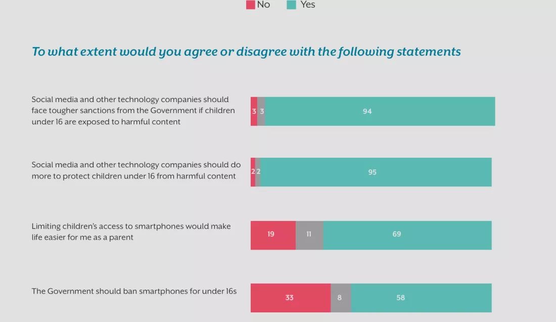 最近对英格兰 2496 名学龄儿童家长进行的一项调查发现,58% 的家长认为政府应该禁止 16 岁以下儿童使用智能手机。IT之家附上相关结果截图如下: