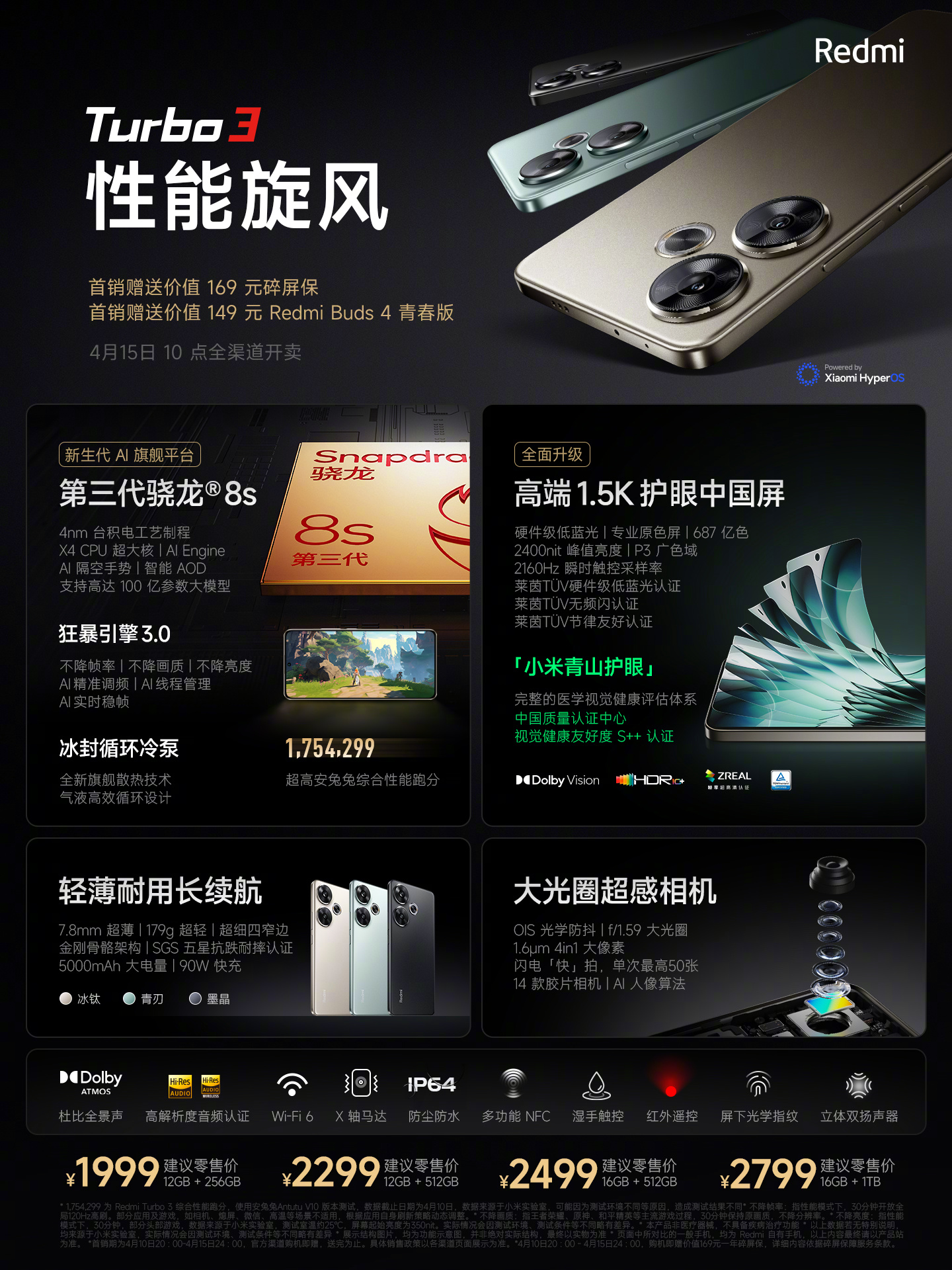IT之家 4 月 15 日消息,Redmi Turbo3 将于今日 10 点开售,搭载第三代骁龙 8s、1.5K 护眼中国屏、5000mAh 电池,售价 1999 元起。