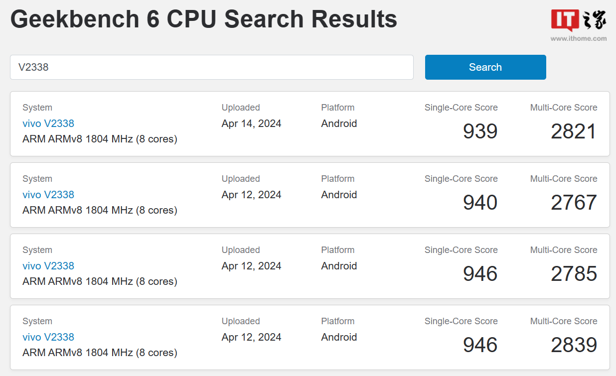 目前 vivo T3x 手机已进行多次 Geekbench 6 跑分,确认搭载骁龙 6 Gen 1 处理器、8GB 内存与 Android 14 操作系统,单核 946 分,多核 2839 分。