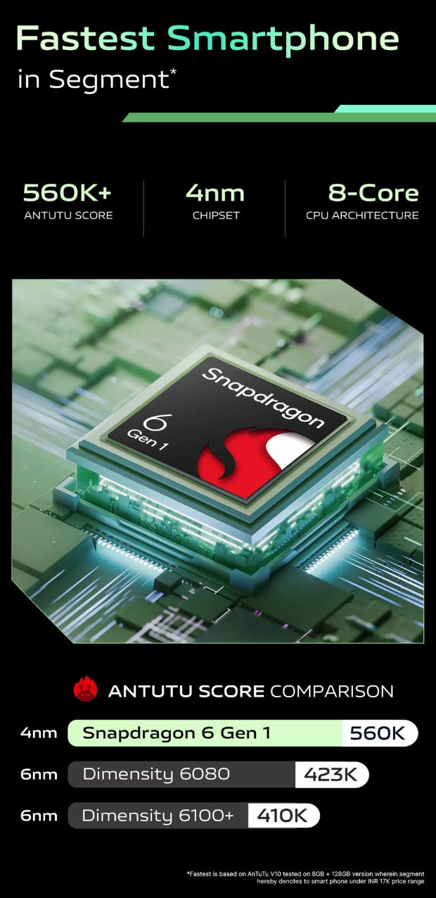 vivo T3x 手机搭载骁龙 6 Gen 1 处理器,8GB + 128GB 版本安兔兔跑分 560000+,官方宣称为“同档最快智能手机”。