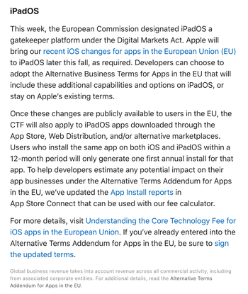 鞭牛士 5月6日消息,苹果官网近日发布开发者公告,宣布计划在今年晚些时候为欧盟地区的iPad开放侧载功能。