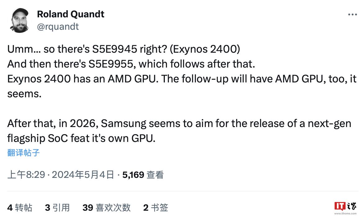 IT之家 5 月 4 日消息,消息源 Roland Quandt 近日发布推文,表示三星计划在 2026 年推出的自家 Exynos 旗舰芯片中采用自研的 GPU 核心。 IT之家…