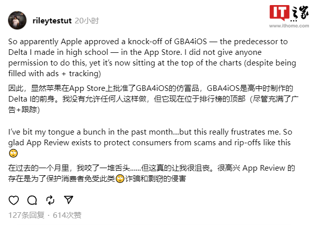 “看来苹果居然审核通过了一个 GBA4iOS 的克隆版本,” Testut 在 Threads 平台发帖表示,“我从未授权任何人这样做,但它现在却占据着排行榜榜首的位置(而且还塞满了广告和跟踪器)。” 他讽刺道,“太感谢 App Store 审核的存在了,它保护用户免受此类骗局和山寨品的侵害。”