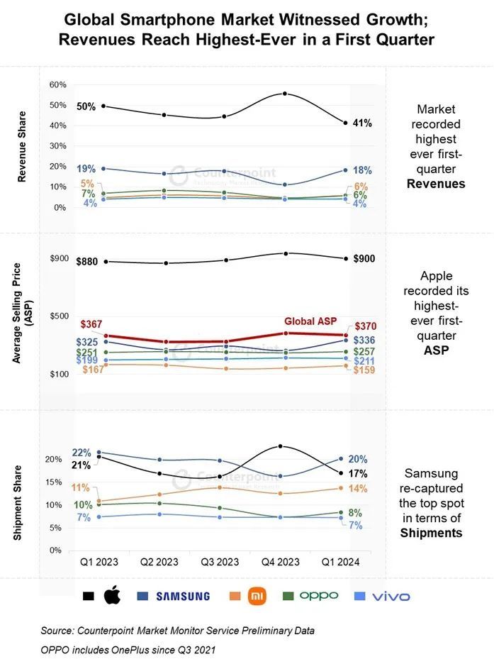 文章来源于互联网:凤凰网-Counterpoint:全球智能手机市场2024年Q1同比增长6%,三星重夺第一