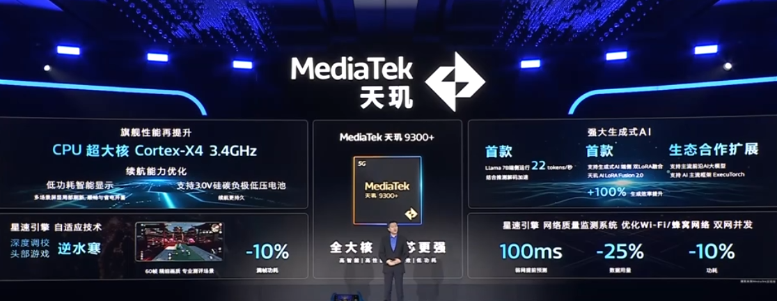 天玑 9300+ 号称“业界首款”实现更高速 Llama 2 7B 端侧大模型运行,速度达 22 tokens / 秒;“头部吃鸡游戏”满帧功耗降低 20%;搭载星速引擎,优化 Wi-Fi / 蜂窝网络,支持双网并发。