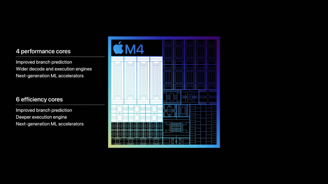 在 CPU 方面,M4 拥有 10 核心 CPU,包含 4 个性能核心和 6 个能效核心。下一代核心改进了分支预测功能,为性能核心提供更广泛的解码和执行引擎,为能效核心提供更深层次执行引擎。