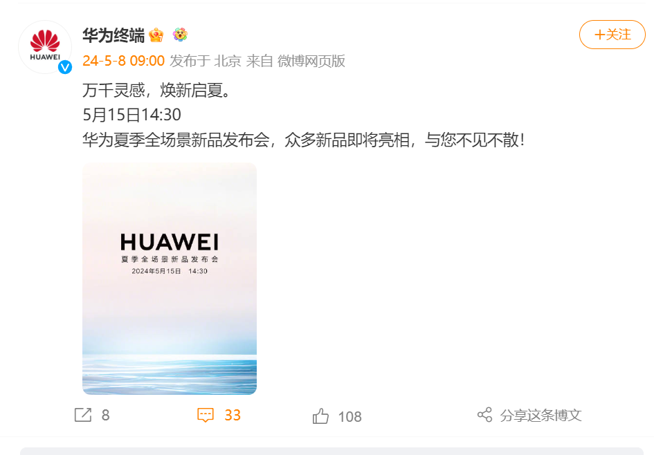 凤凰网科技讯 (作者/周文浩)5月8日,华为终端在社交媒体发文,宣布华为夏季全场景新品发布会将5月15日14:30举行。