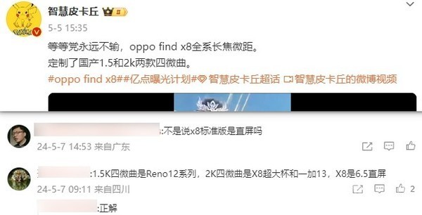 不过,在OPPO Find X8系列的屏幕方面,此前的一些信息与上述博主的爆料似乎有所出入。对此,有网友表示,Find X8标准版不是直屏吗?还有网友曝光了两块定制屏幕的使用情况。据悉,1.5K四微曲屏对应的是Reno12系列,2K四微曲屏则由Find X8超大杯(即Ultra机型)和一加13搭载,至于Find X8,配备的是一块6.5英寸直屏。另外一名似乎知晓内情的网友表达了肯定,“正解。”