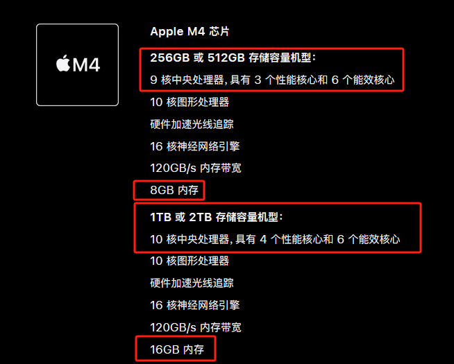 256GB和512GB存储容量机型,搭载的是9核CPU的M4芯片和8GB内存;