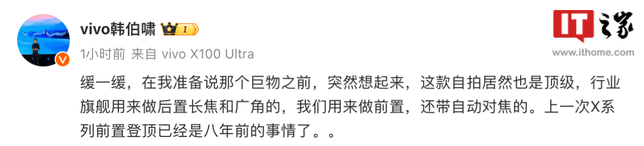 IT之家 5 月 8 日消息,vivo 产品经理韩伯啸在微博上透露,vivo X100 Ultra 自拍也是“顶级”,行业旗舰用来做后置长焦和广角的,vivo 用来做前置,还带自动对焦。上一次 X 系列前置“登顶”已经是八年前的事情了。