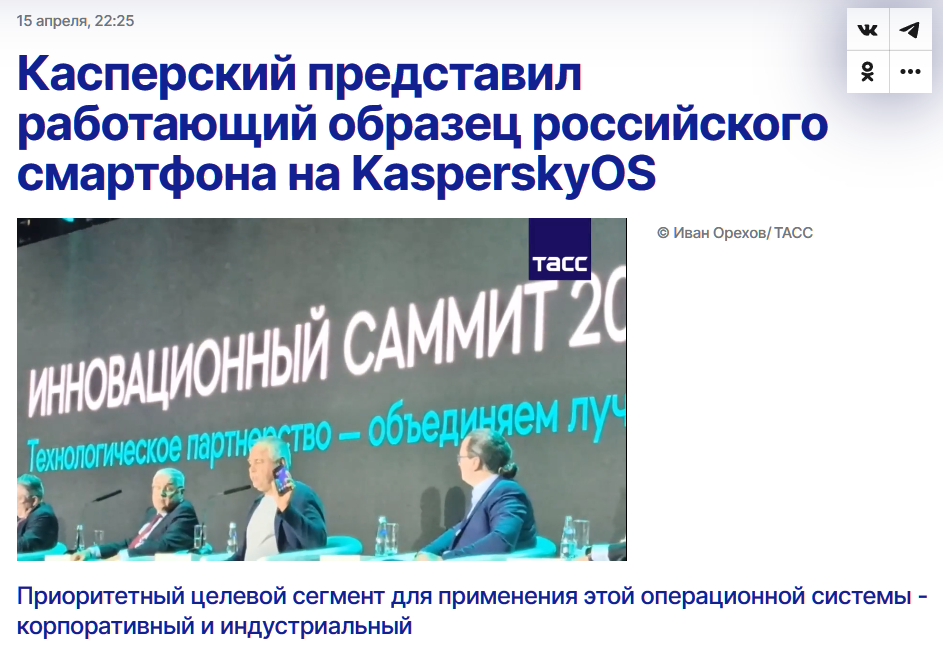 文章来源于互联网:IT之家-卡巴斯基展示搭载 KasperskyOS 的俄罗斯产智能手机原型机,号称所有软件自研