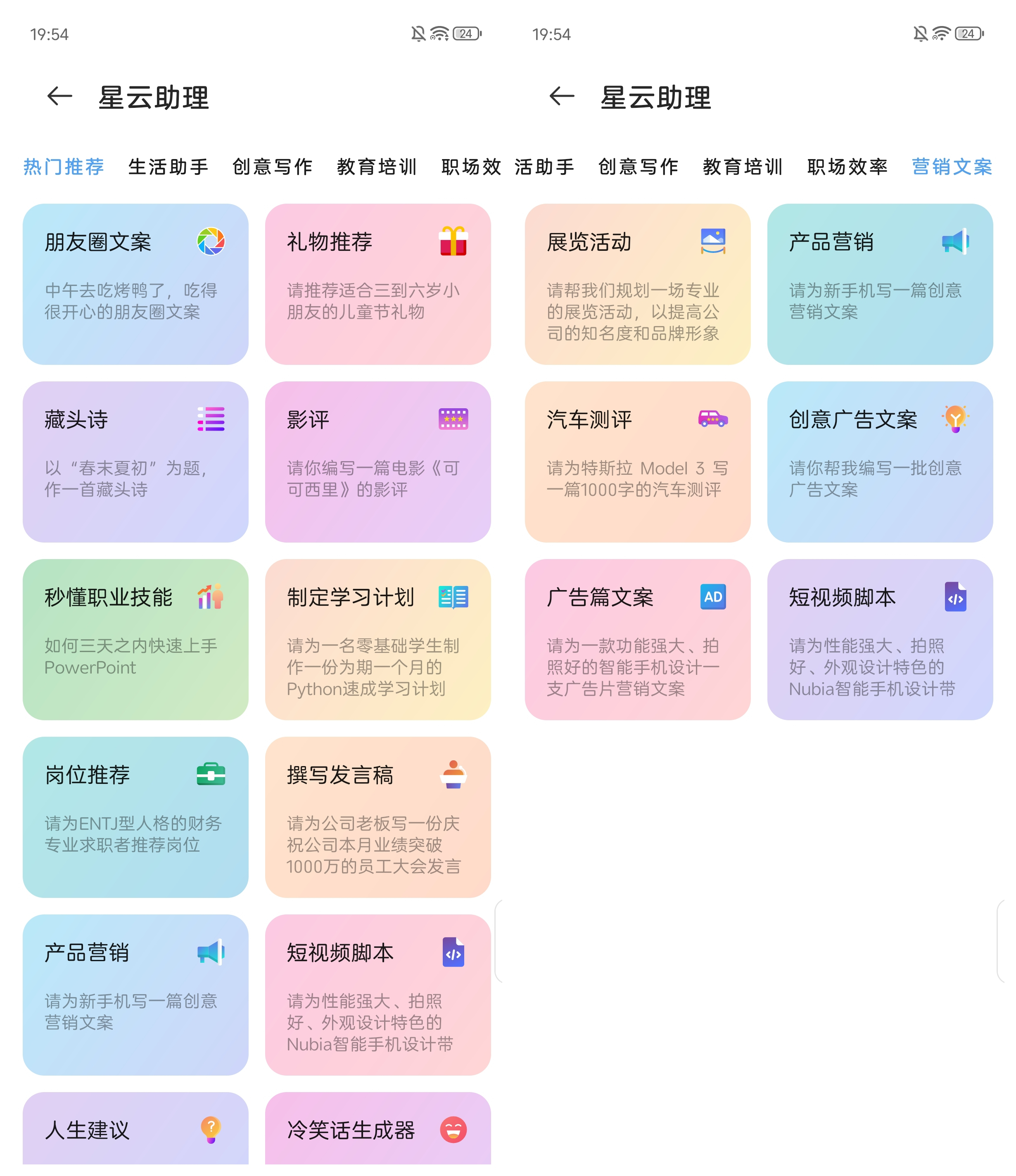 打开手机中的智慧语音,就能找到大模型加持下的“星云助理”,在技能方面,支持聊天对话、知识问答,创意写作等生产力功能。