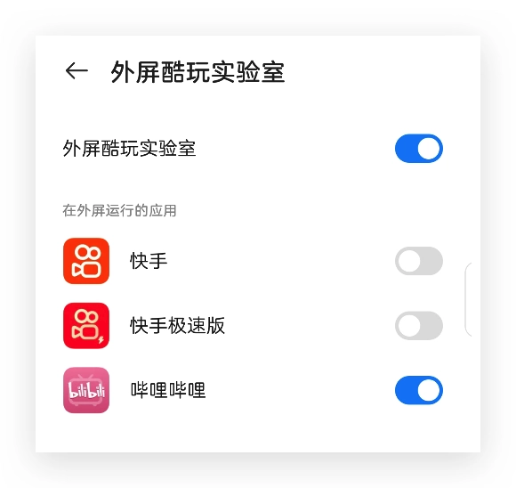 第三方应用生态方面,目前支持快手、哔哩哔哩两款应用,不过这个功能被藏在了开发者选项中,开启开发者选项后,找到“外屏酷玩实验室”即可开启。