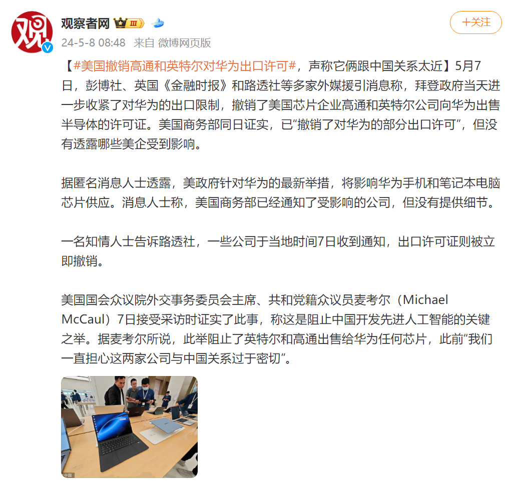 不知道各位差友今天有没有看到这样一条新闻:美国撤销了本土芯片企业高通和英特尔公司向华为出售半导体的许可证,这意味着之后华为自家产品很有可能用不了这两家公司的芯片。