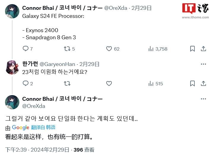 此外,消息称三星 Galaxy S24 FE 手机会有 Exynos 2400 和高通骁龙 8 Gen 3 两种处理器,不过大部分都采用 Exynos 2400,只有极少数市场会采用骁龙芯片,而且三星还有统一使用 Exynos 芯片的打算。
