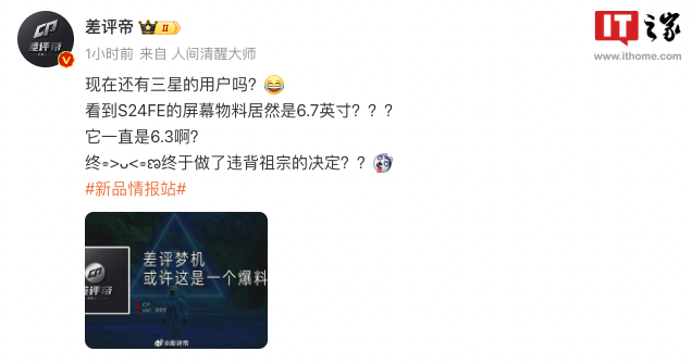 IT之家 4 月 16 日消息,博主 @差评帝今日发帖称,三星 Galaxy S24 FE 手机的屏幕物料尺寸为 6.7 英寸,并表示此前“它一直是 6.3,终于做了违背祖宗的决定”。