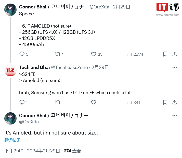 爆料信息中还透露,三星 Galaxy S24 FE 会采用 6.1 英寸 AMOLED 屏幕,不过该手机尺寸目前并未确定。这款智能手机预计还将配备 12GB LPDDR5X RAM,以及 128GB(UFS 3.1)和 256GB(UFS 4.0)两种存储容量。