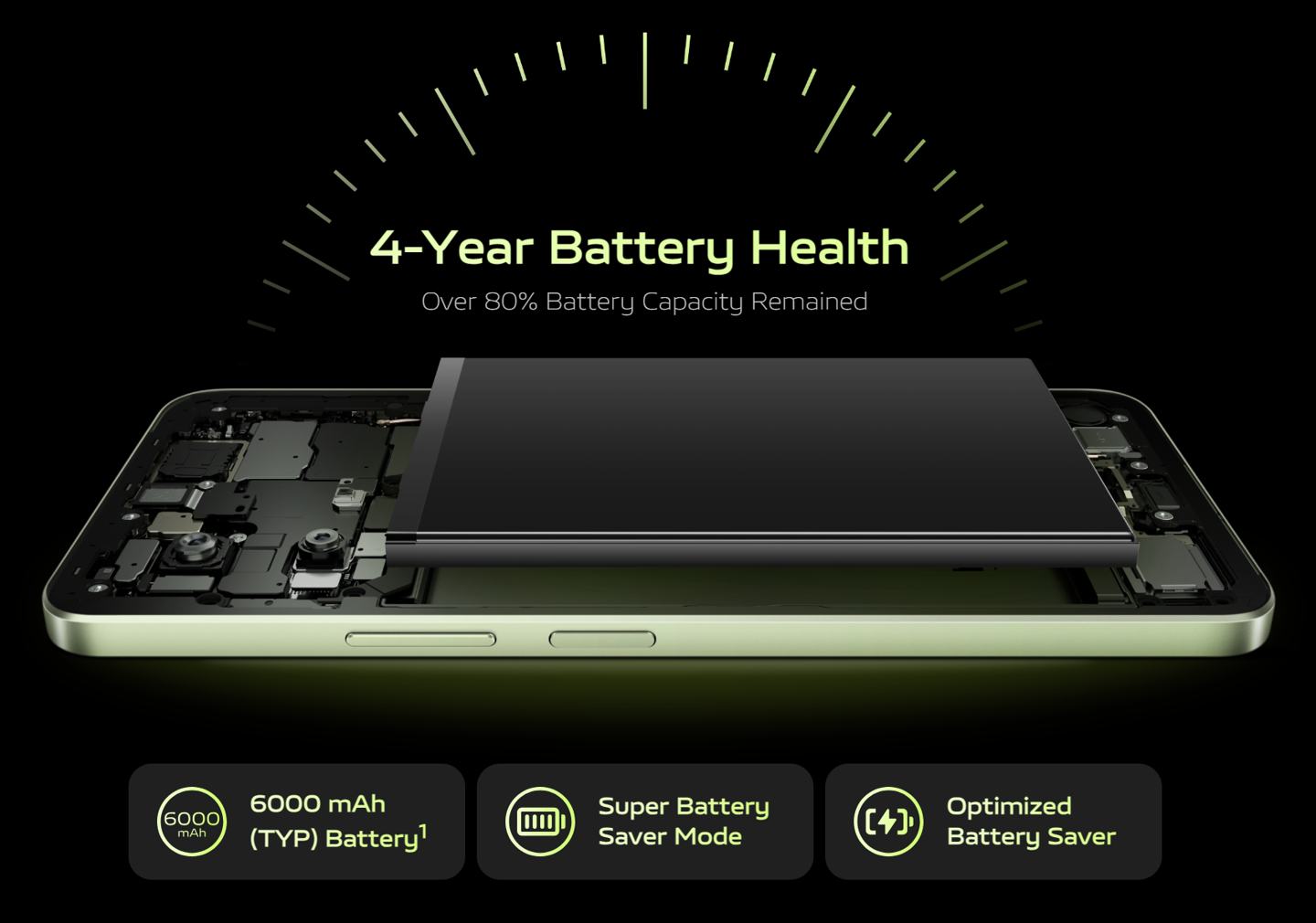 该手机搭载骁龙 6 Gen 1 处理器,安兔兔跑分 561250+,并使用 6000mAh 电池,厚度为 7.99mm,承诺四年使用后电池容量仍维持 80%。