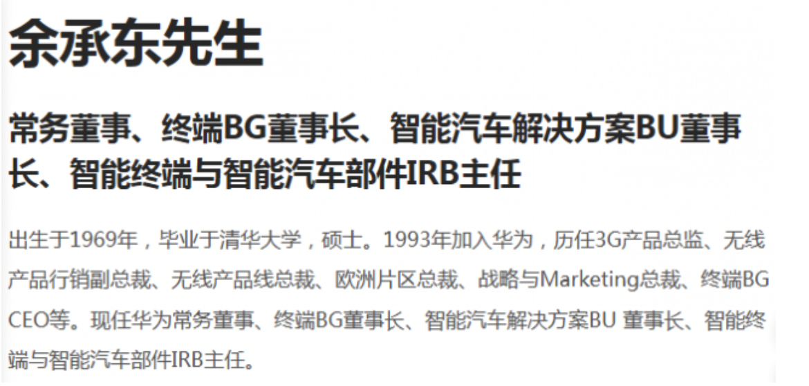 现在华为官网更新了管理层信息,公开了这一调整。截至目前,余承东担任华为常务董事、终端 BG 董事长、智能汽车解决方案 BU 董事长、智能终端与智能汽车部件 IRB 主任。此外,余承东的微博简介也进行了更新,由终端 BG CEO 变更为终端 BG 董事长。