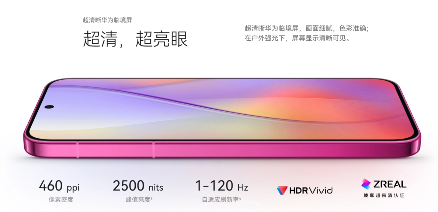 该机配有 6.6 英寸 2760 × 1256 像素 OLED 屏,支持 1-120Hz LTPO 自适应刷新率、1440Hz 高频 PWM 调光、300Hz 触控采样率,配有第二代昆仑玻璃。