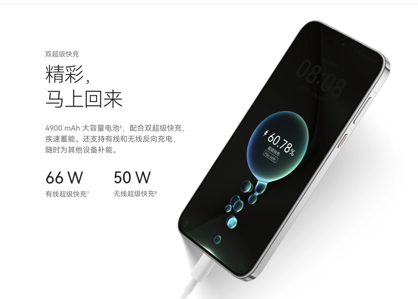 此外,该机拥有 4900mAh 电池,支持 66W 有线快充、50W 无线快充、7.5W 无线反向充电,搭载 Type-C 接口(USB 3.1 GEN1)。