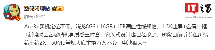 据博主 @数码闲聊站 爆料,一加 Ace 3 Pro 手机搭载骁龙 8 Gen 3 处理器 + 16GB+1TB 满血性能规格,采用 1.5K 曲屏 + 金属中框 + 新镀膜工艺玻璃机身质感三件套,家族式设计也已经改了。目前影像方面还存在变数,是否有 2X 长焦还未知,50Mp 常规大底主摄方案不变,电池很大。