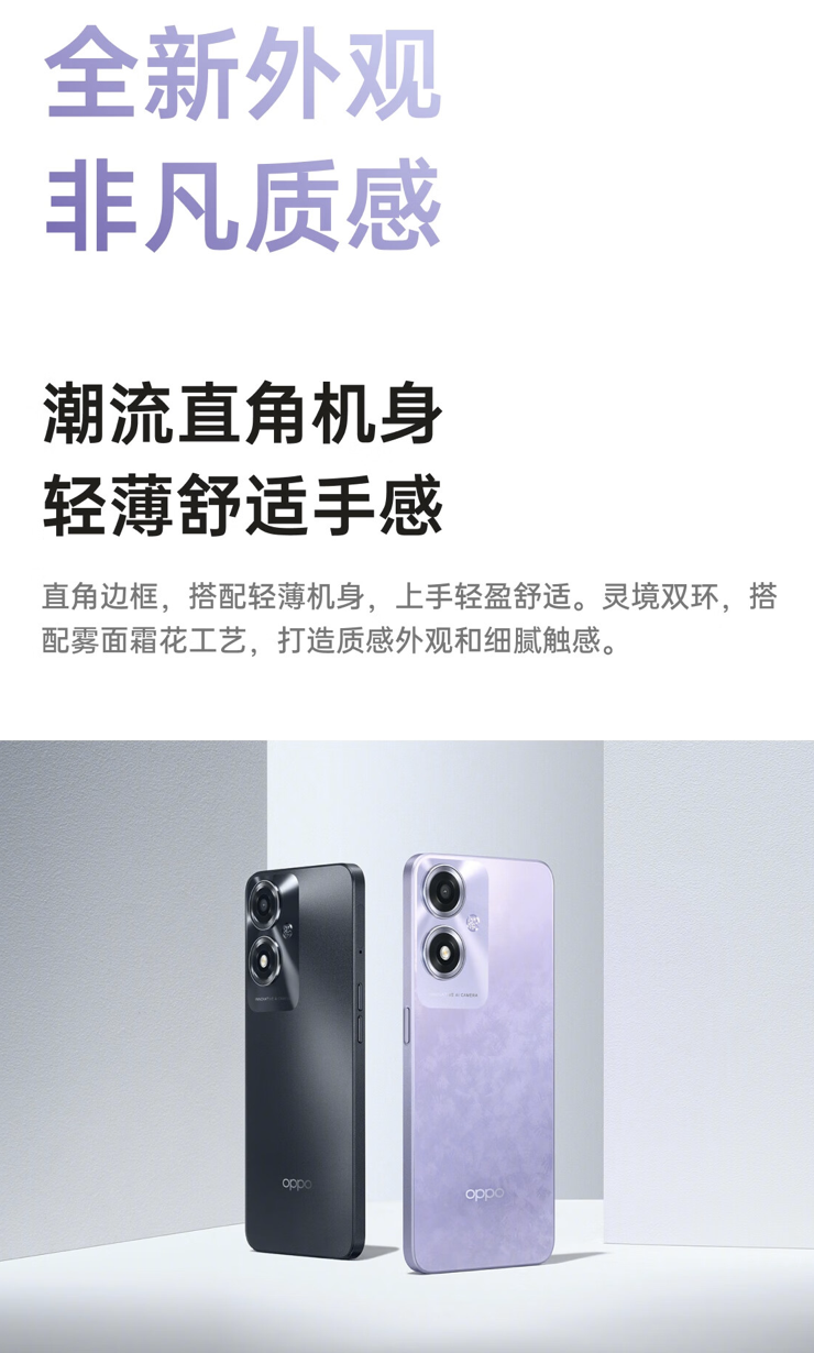 设计方面,这款手机配备直角边框,可选“幻影紫”、“凝夜黑”配色,背板采用“雾面霜花”工艺,同时支持 IP54 生活防水,还配备 300% 扬声器,号称“外放音量 85 分贝”。