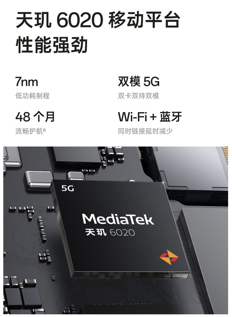 据介绍,这款手机配备 6.56 英寸 720×1612 分辨率 90Hz IPS LCD 屏幕,配备天玑 6020 芯片,搭载 13MP 主摄,前置 5MP 摄像头,内置 5000 毫安时电池,支持 10W 有线充电。