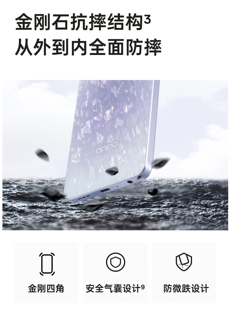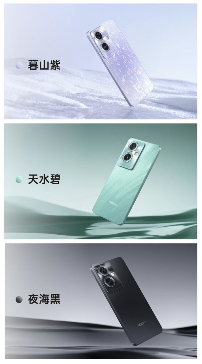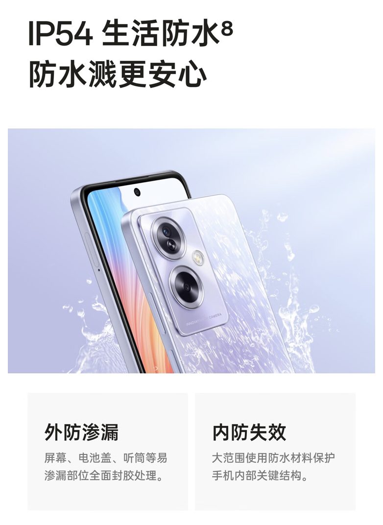 外观方面,这款手机采用“金刚石抗摔结构”,可选“暮山紫”、“天水碧”、“夜海黑”三种配色,支持 IP54 生活防水。