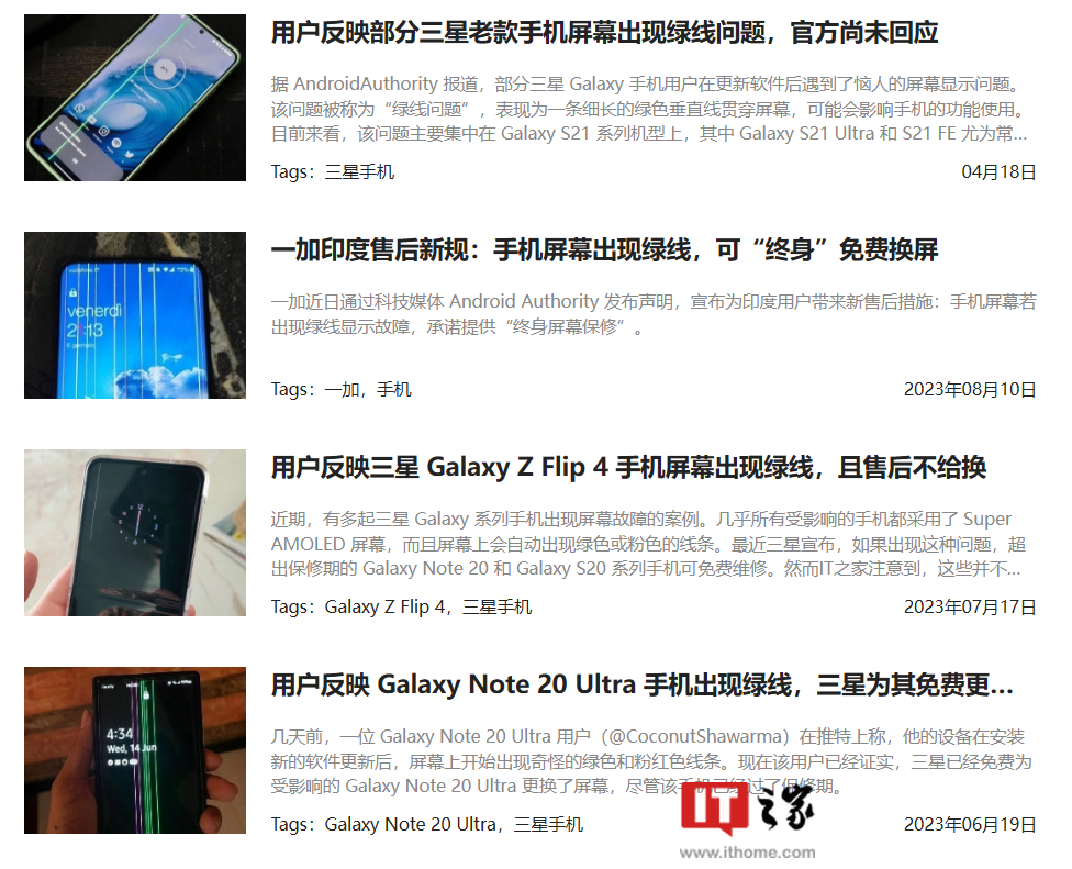 文章来源于互联网:IT之家-受屏幕绿线困扰,三星印度公司为 Galaxy S21 / S22 手机用户免费换屏