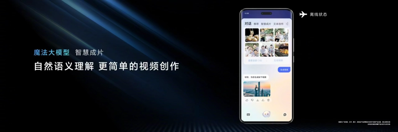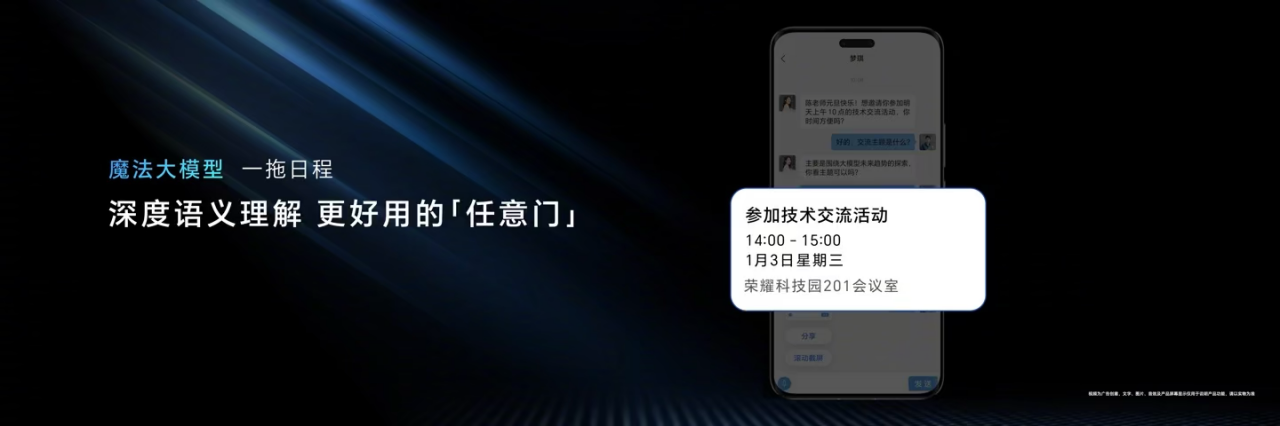 凭借 AI 大模型的支持,荣耀手机可以做到自然语义理解更简单的视频创作,模糊语义理解更精准的图库搜搜,一拖日程,做到立刻生成日程安排。