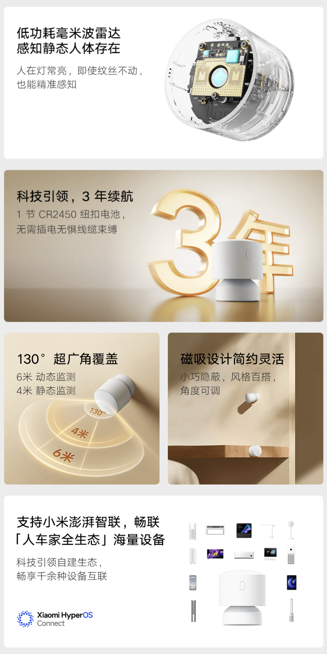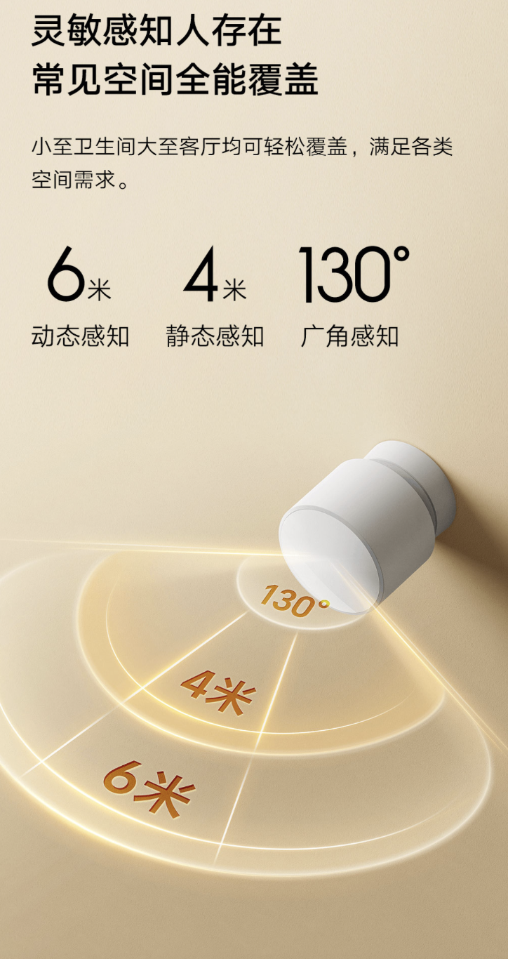 据介绍,这款传感器相对此前“米家人体传感器 2S”主要新增“低功耗毫米波雷达”,能够覆盖 130 度广角,能够动态感知 6 米内(静态感知 4 米内)人体存在,号称“人在灯常亮,即使纹丝不动也能精确感知”。