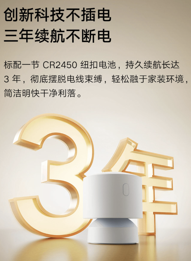 规格方面,这款传感器使用 1 节 CR2450 纽扣电池(号称可实现 3 年续航),内置磁铁,搭配可粘贴的底座便于安装家具各处;同时支持米家 App 查看 24 小时光照度曲线及智能联动。