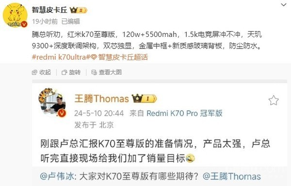 值得一提的是,就在前几日,小米集团总裁卢伟冰在微博上向米粉们询问:大家对K70至尊版有哪些期待?王腾则转发微博表示,自己已经向卢伟冰汇报了K70至尊版的准备情况,产品性能非常强大,后者听完后决定直接增加新机的销量目标。如此看来,卢伟冰对Redmi K70至尊版充满了自信。CNMO猜测,不仅配置全面,新机的价格可能也会有惊喜。