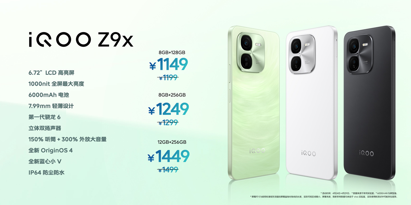 IT之家 4 月 24 日消息,iQOO Z9 系列手机正式发布,其中 iQOO Z9 Turbo 1999 起,iQOO Z9 1499 起,iQOO Z9x 1149 起,4 月 29 日开售,IT之家汇总价格如下: