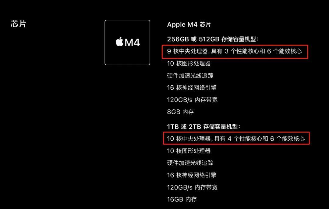 然而,10核的M4只搭载在1TB、2TB的iPad Pro上,256G和512G的iPad Pro,搭载的是9核的M4(3个大核6个小核),比iPad Pro M2还少个大核。