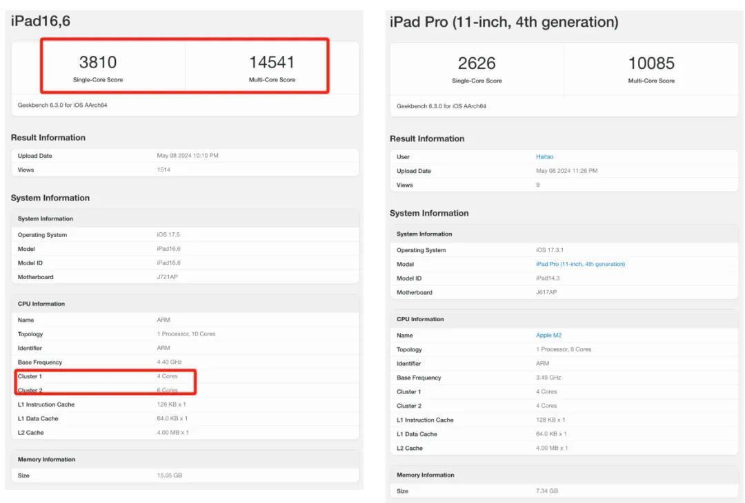 苹果官方表示,M4的CPU(10核)比上一代iPad Pro搭载的M2快了1.5倍。有网友晒出M4的iPad和M2的iPad的geekbench跑分,基本也就是1.5倍。
