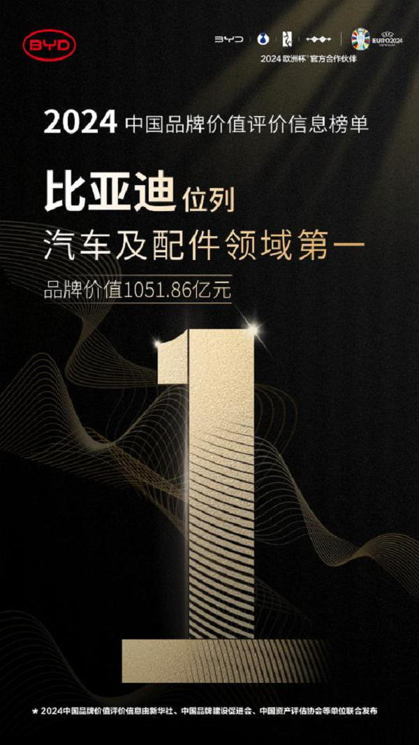 5月11日,新华社、中国品牌建设促进会、中国资产评估协会等单位在浙江德清联合发布“2024中国品牌价值评价信息”。比亚迪凭借1051.86亿元的品牌价值,位列汽车及配件领域第一。