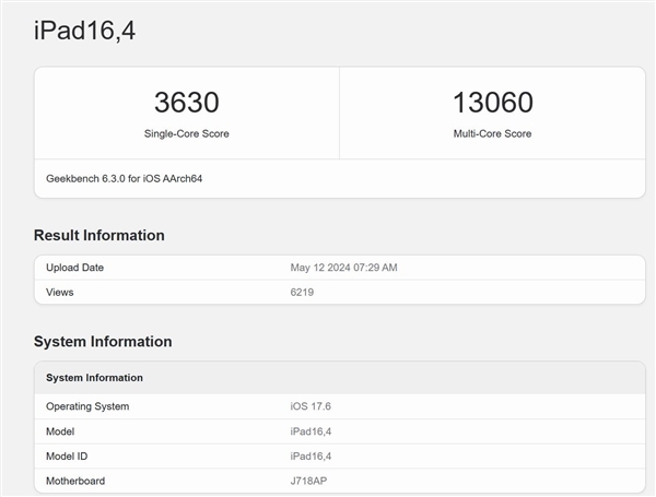 现在9核版M4 iPad Pro现身Geekbench跑分网站,单核成绩是3630,多核成绩是13060。