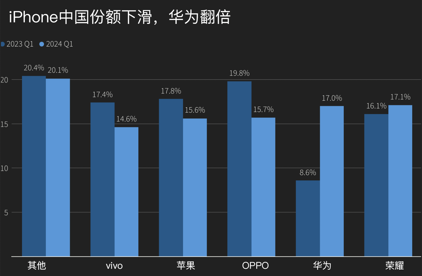 华为发起的新一轮营销攻势对苹果构成了重大挑战。知名研究公司IDC的数据显示,今年第一季度,iPhone在中国的销量大跌6.6%至1080万部。相比之下,华为第一季度的智能手机出货量增长了110%,达到1170万部,超过苹果成为中国第二大智能手机供应商。